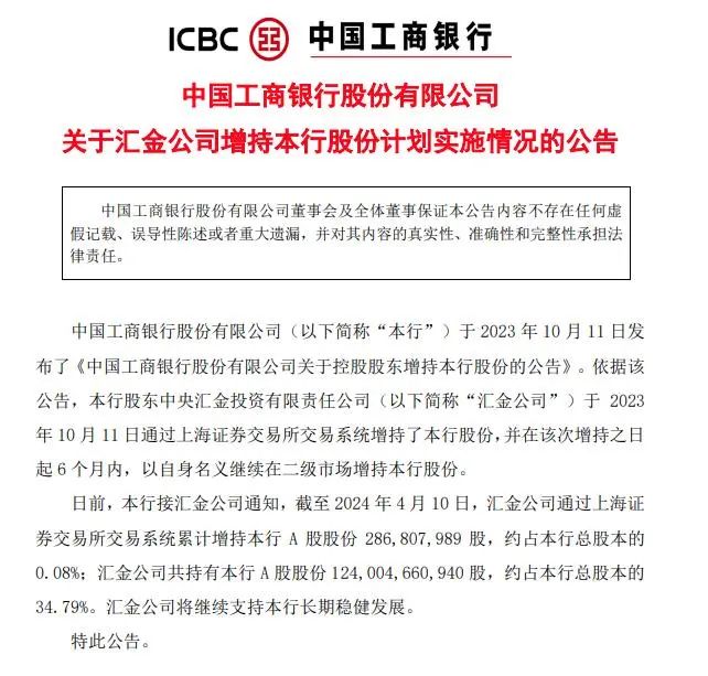 工商银行:汇金公司累计增持2.87亿股  工商银行公告称,截至2024年4月10日,汇金公司通过上海证券交易所交易系统累计增持本行A股股份286,807,989股,约占本行总股本的0.08%;汇金公司共持有本行A股股份124,004,660,940股,约占本行总股本的34.79%。