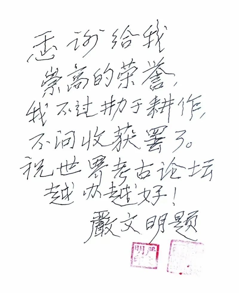 “感谢给我崇高的荣誉,我不过勤于耕作,不问收获罢了。”92岁的严文明亲笔写下了感言。