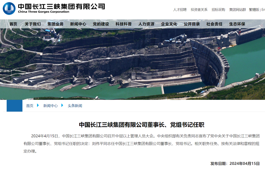 据中国长江三峡集团有限公司网站消息:2024年4月15日,中国长江三峡集团有限公司召开中层以上管理人员大会。中央组织部有关负责同志宣布了党中央关于中国长江三峡集团有限公司董事长、党组书记任职的决定:刘伟平同志任中国长江三峡集团有限公司董事长、党组书记。相关职务任免,按有关法律和章程的规定办理。