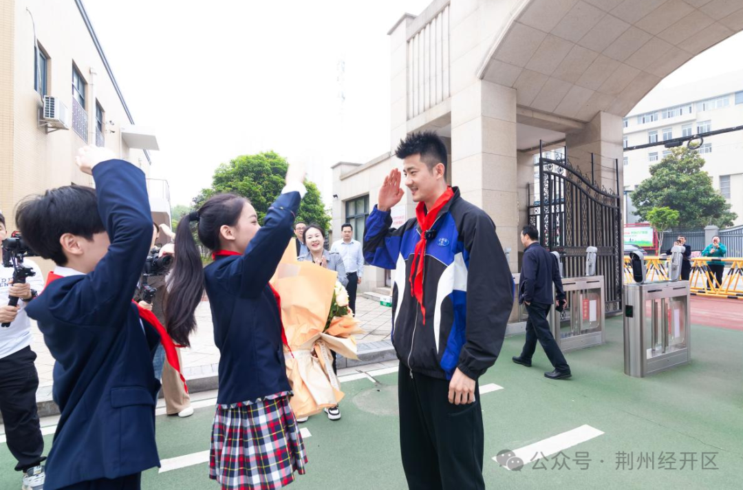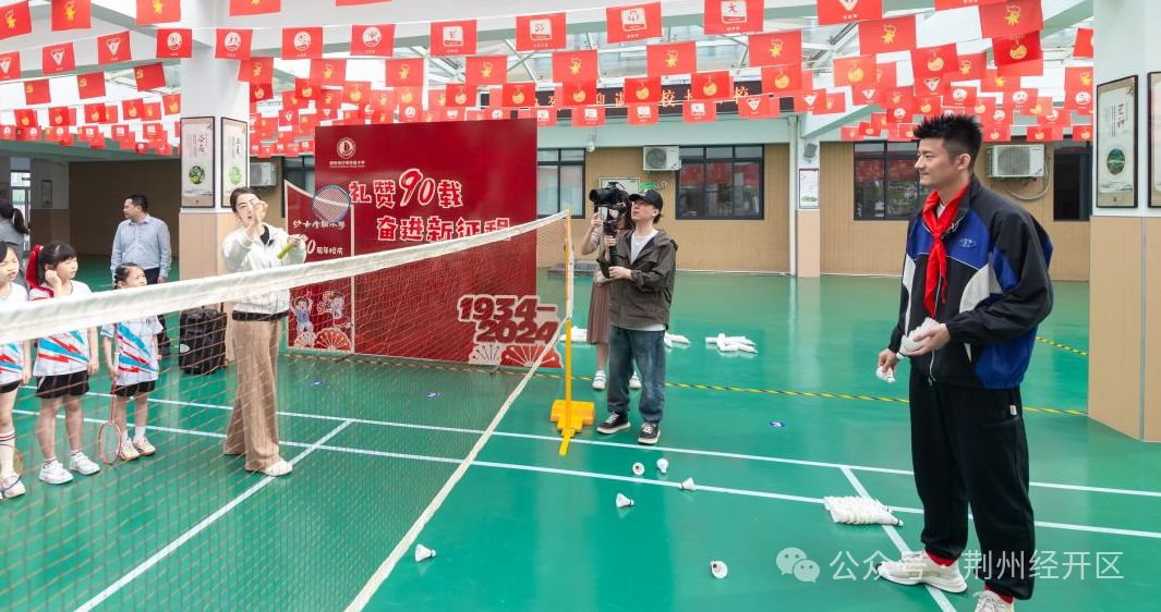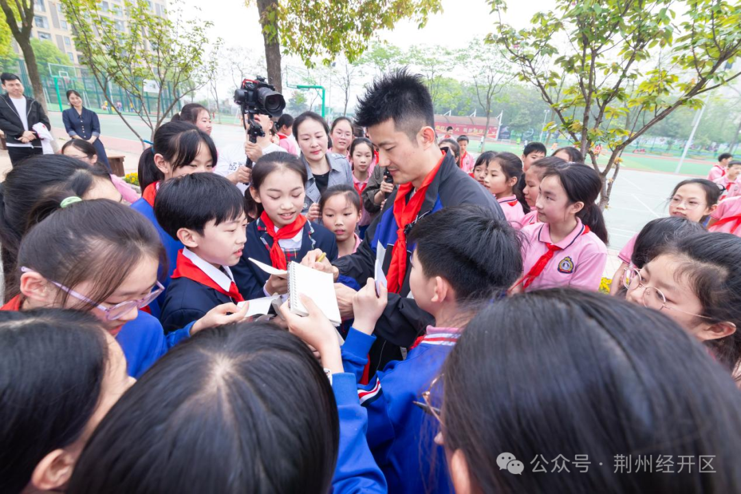 4月14日上午,2016年里约奥运会羽毛球男子单打冠军、沙市实验小学名誉校长谌龙,带着同是羽毛球世界冠军的妻子王适娴回到实小,与学校师生面对面交流,传授体育专业技能,传播拼搏进取的体育精神。荆州经开区党工委委员彭国飞参加活动。