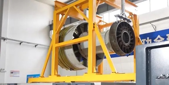 ▲ 这台保持高频振动的设备,正在对一台近3吨重的飞机发动机进行振动试验。在此之前,没有设备可以完成这个重量等级的整机振动试验。