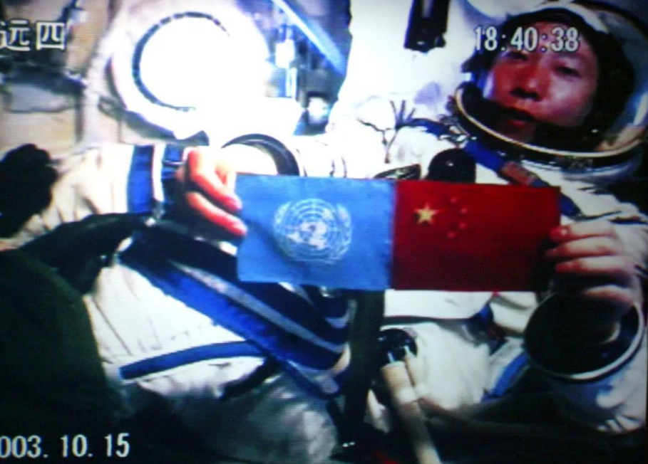2003年10月15日,神舟五号载人飞船成功发射,杨利伟成为第一位造访太空的中国人,中国也成为世界上第三个独立掌握载人航天技术的国家。杨利伟从太空向世界各国人民问好,并在舱内并列展示了五星红旗和联合国旗。这个画面载入史册。