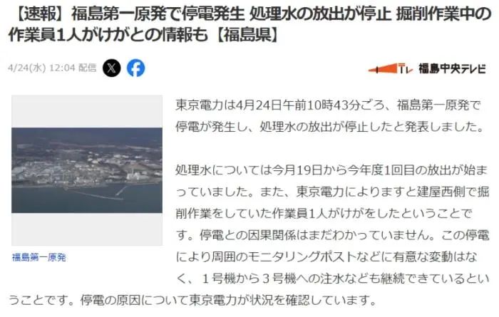 据日本福岛中央电视台报道,当地时间24日上午10时43分许,福岛第一核电站突发停电,正在进行中的核污染水排放工作随即暂停。
