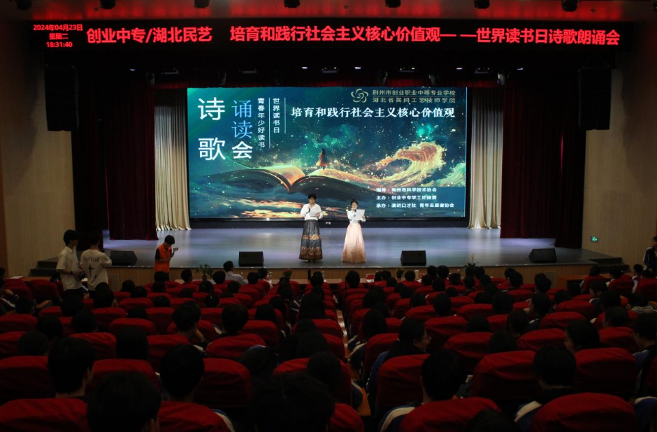 江汉风报道:4月23日正值第29个“世界读书日”之际,为深化培育青少年养成良好的阅读习惯,培育和践行社会主义核心价值观——世界读书日“阅”在春日“诵”一诗 共奋斗诗歌朗诵会在科普教育基地创业中专学术报告厅举行。