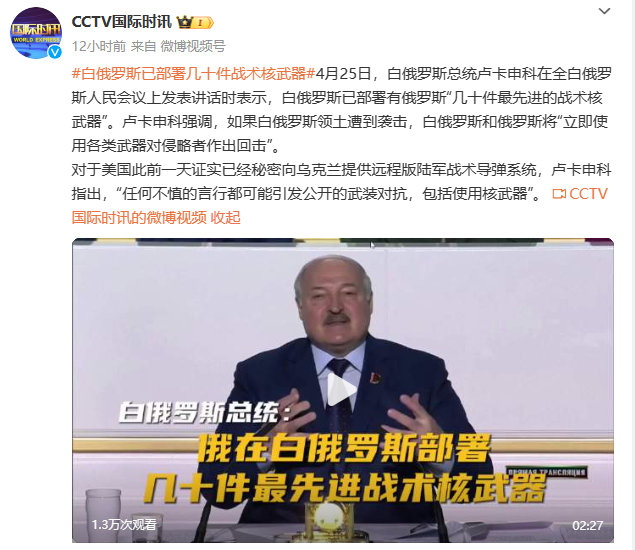 4月25日,白俄罗斯总统卢卡申科在全白俄罗斯人民会议上发表讲话时表示,白俄罗斯已部署有俄罗斯“几十件最先进的战术核武器”。卢卡申科强调,如果白俄罗斯领土遭到袭击,白俄罗斯和俄罗斯将“立即使用各类武器对侵略者作出回击”。