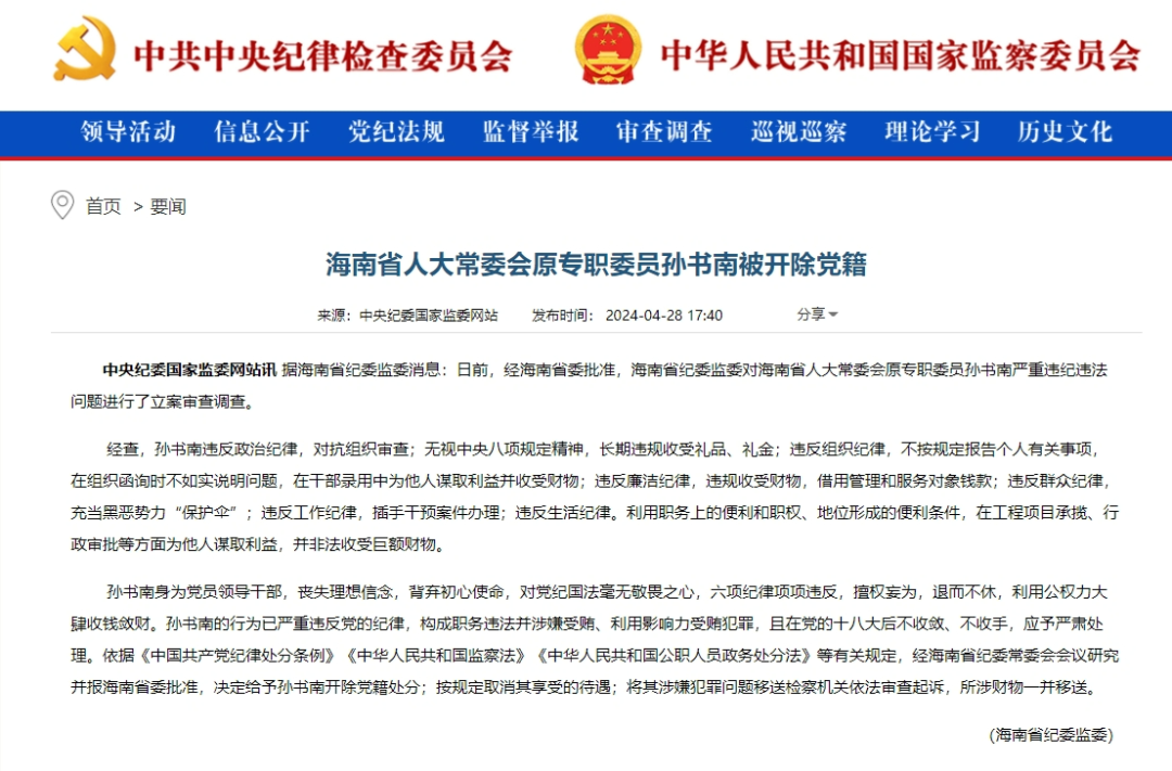 据海南省纪委监委消息:日前,经海南省委批准,海南省纪委监委对海南省人大常委会原专职委员孙书南严重违纪违法问题进行了立案审查调查。