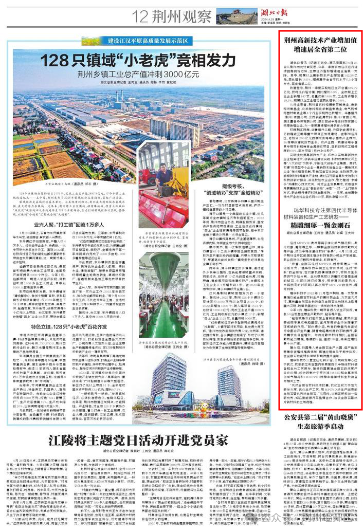 瑞华科技于2022年11月落户荆州,是一家聚焦高端功能金刚石材料生产的高科技企业,力求在大尺寸、高质量金刚石生长装备及金刚石生长技术上取得重大突破,破解我国在这一领域的技术难题。