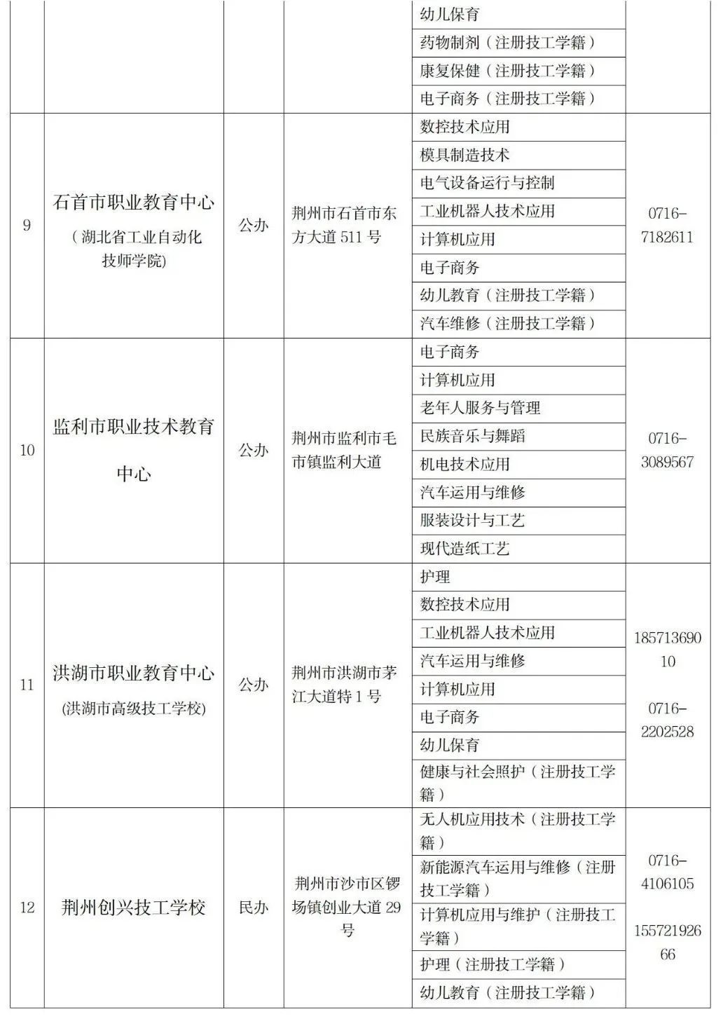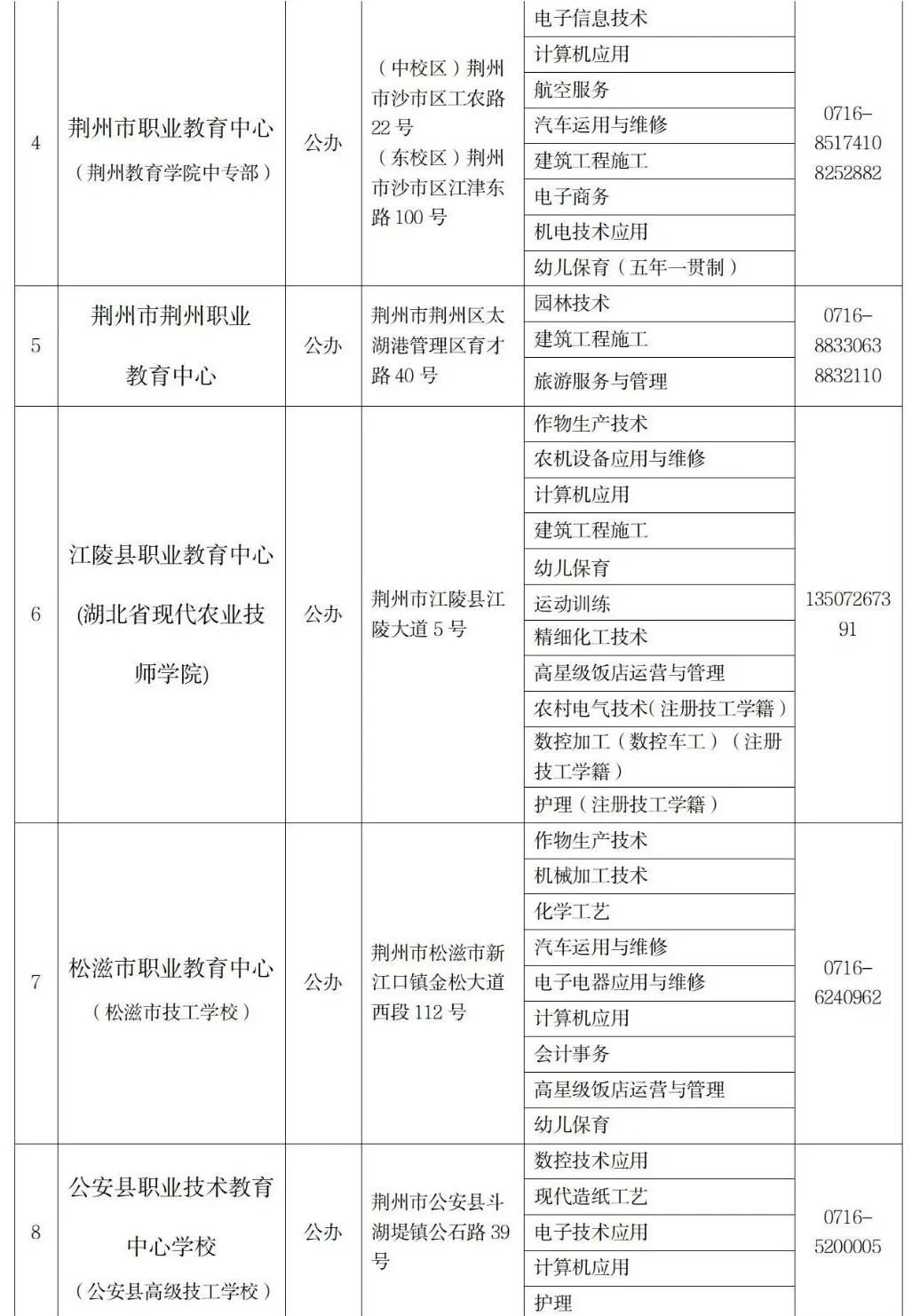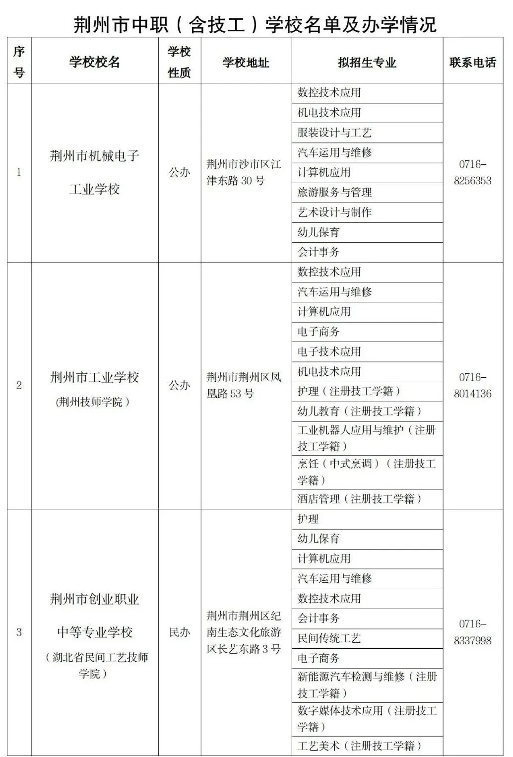 荆州发布市内具备招生资质的中职学校名单 2024-05-02 19:17 荆州发布 0 为方便广大考生报考我市中职学校(含技工学校,下同),现将荆州市内具备招生资质的中职学校名单予以公布。请家长和学生认真甄别,谨慎报考,做到心中有数,防止上当受骗。如有疑问,可向荆州市教育局职成科咨询。联系电话:0716-4132849。
