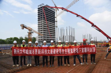 江汉风报道:5月7日,在荆州大学城(城市更新)科创大厦建设项目施工现场,随着大平台最后一次水泥浇注完成,标志着由中建三局三公司负责施工的主楼双塔地下室顺利如期封顶。