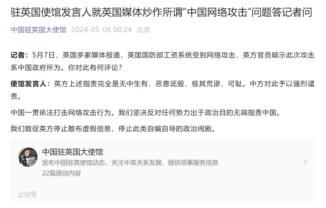 当地时间5月7日,中国驻英国使馆发言人就英国媒体炒作所谓“中国网络攻击”问题答记者问。