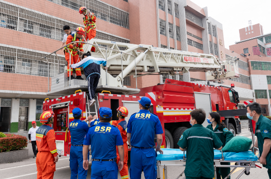 救援车辆疾驰,警笛呼啸;队员目光坚毅,神情肃穆。演练模拟南岳中学教学楼电路起火,学校广播发出火警疏散信号并报警,学生在抢险救援组和老师的指挥下,用湿毛巾捂住口鼻,“猫腰”有序撤离至操场。消防救援大队抵达现场开展灭火行动,出动云梯消防车开展高空救援、抢救被困人员,医疗救助组急救车现场待命,对抢救下来的被困人员开展医疗救护。