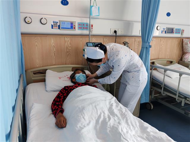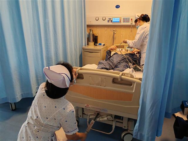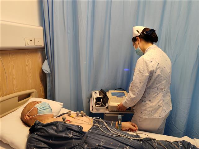 心内科护士肖婵正在给即将出院的患者进行6分钟步行试验,通过移动数据监测包判断患者的心肺功能等级。