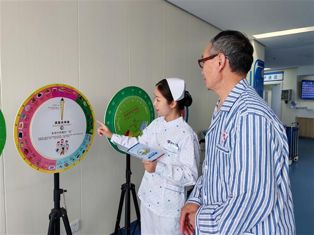 在心内科知识园地,护士李利正在教心衰患者如何做好居家管理,例如使用带刻度的水杯控制好每天的饮水量、饮食中的减盐技巧等。护士在给患者进行宣教时,从环境的布置,到科普形式的多样化,都十分贴心。