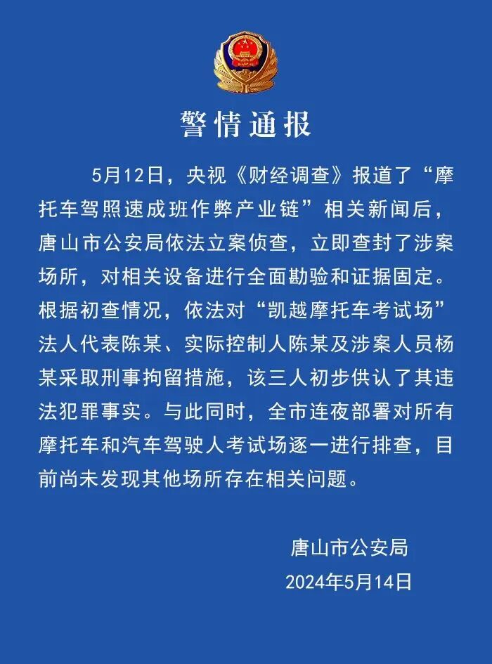5月12日,央视《财经调查》报道了“摩托车驾照速成班作弊产业链”相关新闻后,唐山市公安局依法立案侦查,立即查封了涉案场所,对相关设备进行全面勘验和证据固定。根据初查情况,依法对“凯越摩托车考试场”法人代表陈某、实际控制人陈某及涉案人员杨某采取刑事拘留措施,该三人初步供认了其违法犯罪事实。与此同时,全市连夜部署对所有摩托车和汽车驾驶人考试场逐一进行排查,目前尚未发现其他场所存在相关问题。