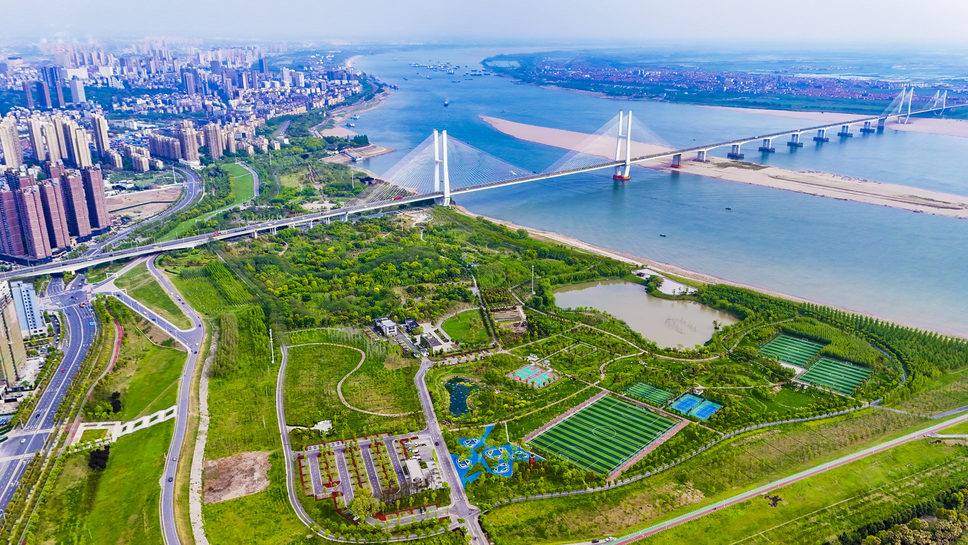 鸟瞰荆州长江沿岸郁郁葱葱,生态公园绿意盎然 张梦瑶 摄