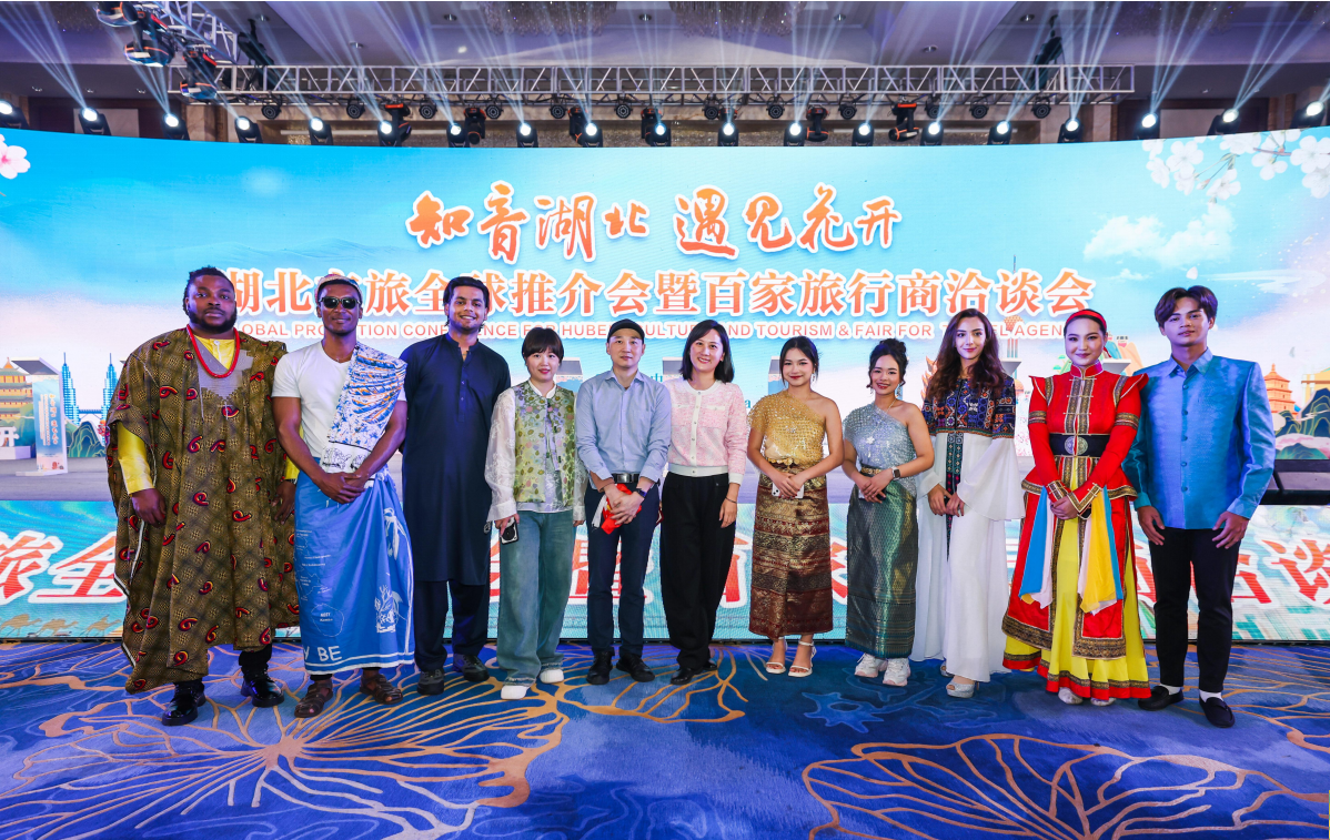 “湖北文旅全球推介暨百家旅行商洽谈会”上各国代表合影留念
