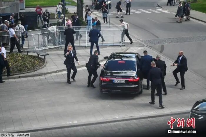 当地时间5月15日,发生枪击事件后,安全人员将斯洛伐克总理菲佐转移到车里。