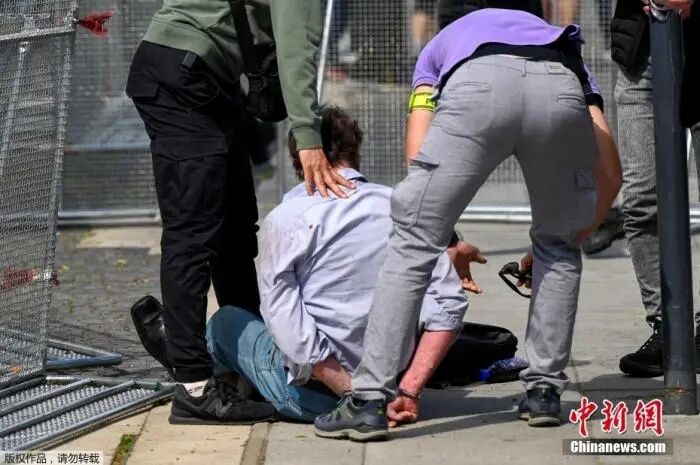 当地时间5月15日,发生枪击事件后,一名男子在路边被控制。