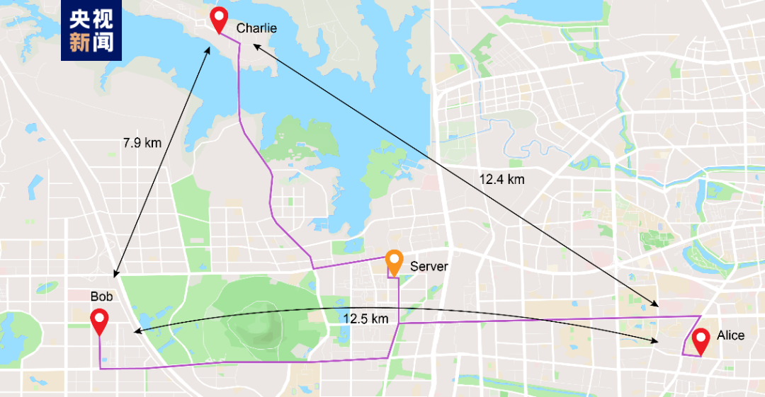 图:实验节点布局示意图。其中Alice节点位于中国科大东区、Bob节点位于合肥创新产业园、Charlie节点位于安徽光机所。