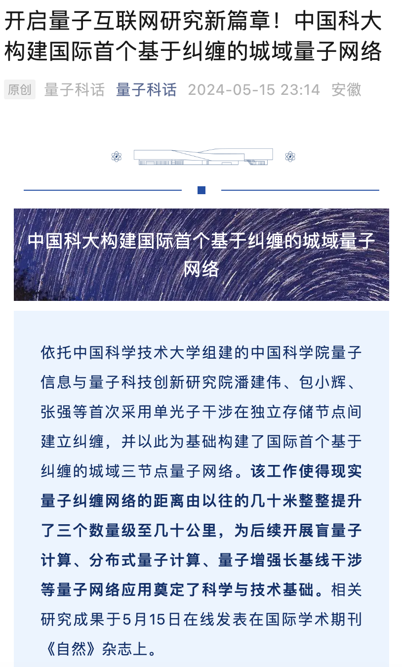 该工作使得现实量子纠缠网络的距离由以往的几十米整整提升了三个数量级至几十公里,为后续开展盲量子计算、分布式量子计算、量子增强长基线干涉等量子网络应用奠定了科学与技术基础。相关研究成果于5月15日在线发表在国际学术期刊《自然》杂志上。(了解详情:开启量子互联网研究新篇章!中国科大构建国际首个基于纠缠的城域量子网络)