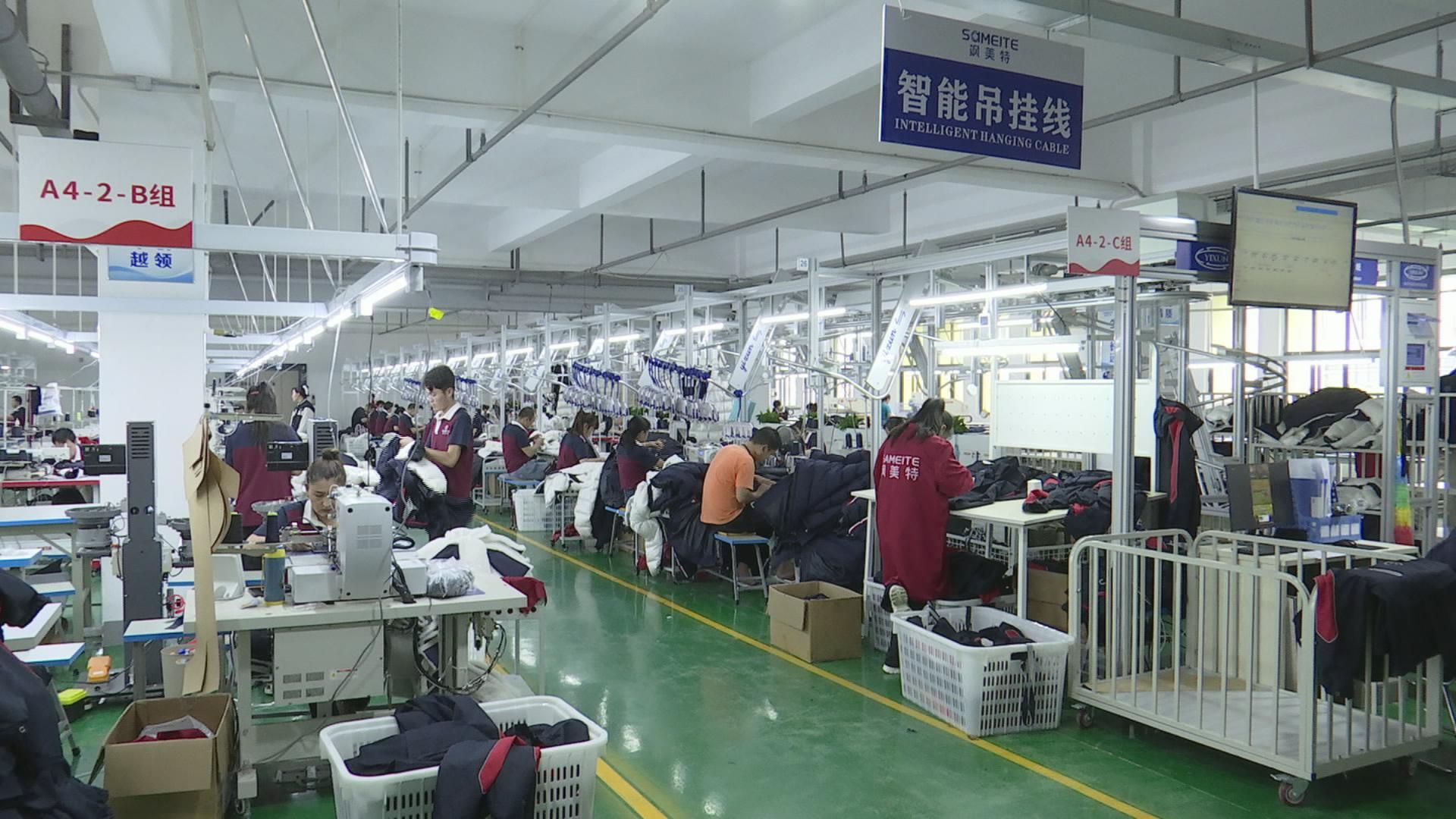 波司登飒美特华中服装生产基地 总经理 赵军 :用了短短不到2个月的时间,就可以正常生产了,加上岑河当地有这么多年的婴童装的功底,不管是原辅料,还是销售端,这个地方都具备,我们的订单量已经排到7月份,年产值3到5亿,我们的计划是80到100万件。