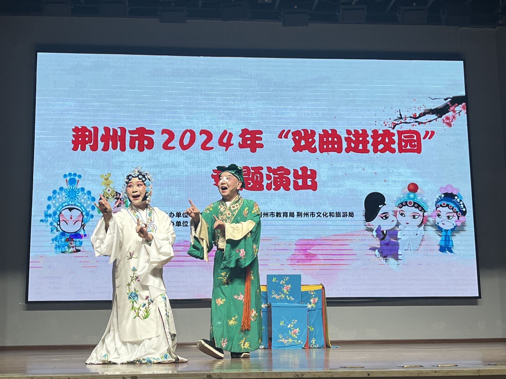 伴随着铿锵的锣鼓声,荆州市地方戏曲传承院的舞蹈演员们身着戏服,以娴熟的演绎、矫健的身姿和婉转的唱腔,为大家分别演绎了《贵妃醉酒》《四知却金》等经典片段,主持人还现场邀请3位同学上台跟着戏曲演员学习水袖等动作,让同学们零距离接触戏曲,在欣赏中入耳,在体验中入脑。