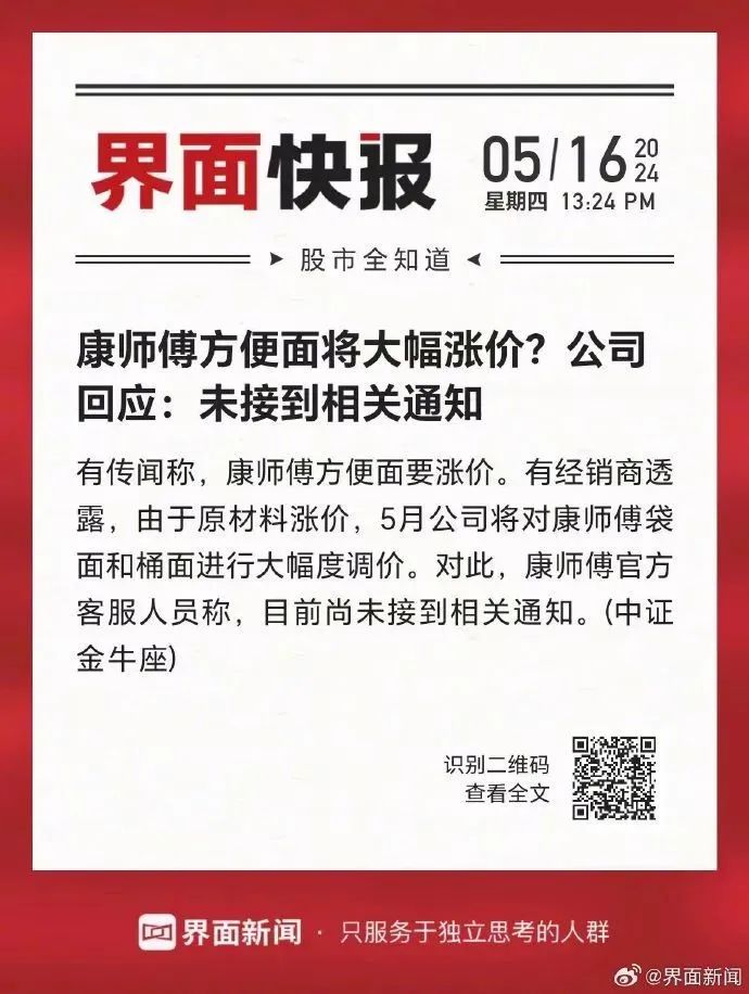 与此同时,康师傅官方客服人员回应中国证券报,目前尚未接到相关通知。