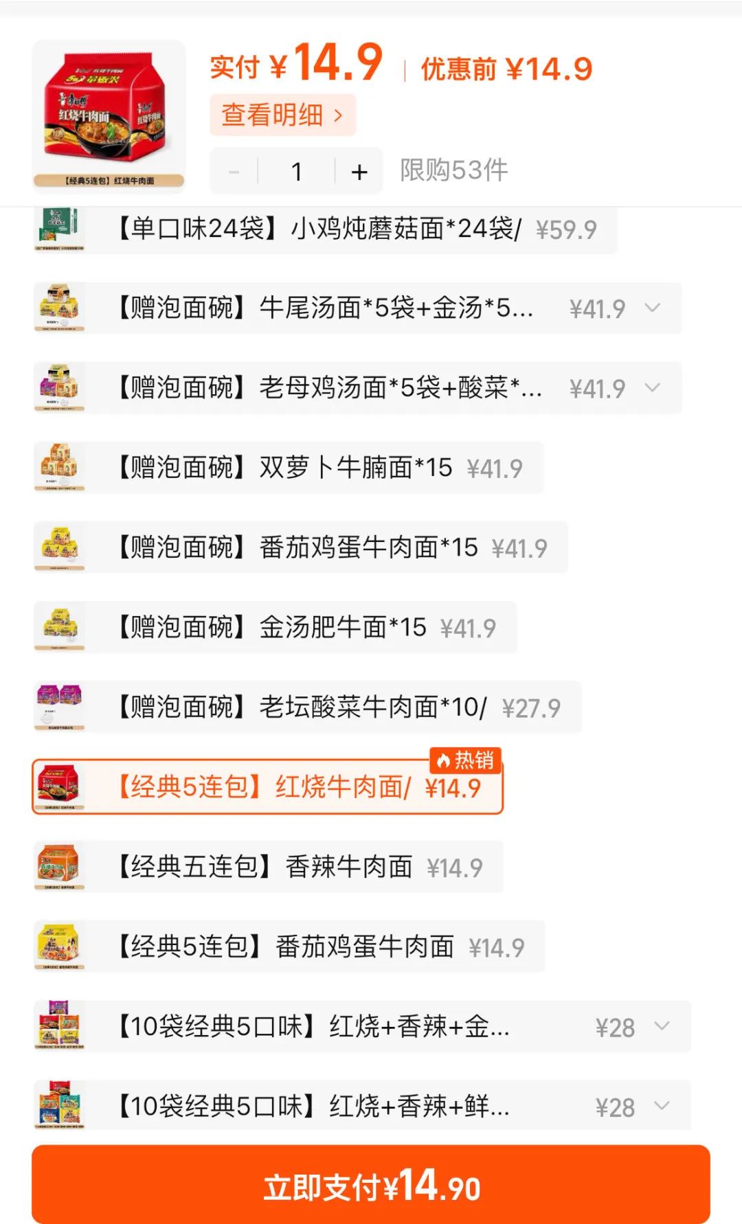 截至发稿前,新闻晨报记者查询康师傅天猫旗舰店发现,其经典产品红烧牛肉面目前为14.9元5包,算下来是2.98元一包。