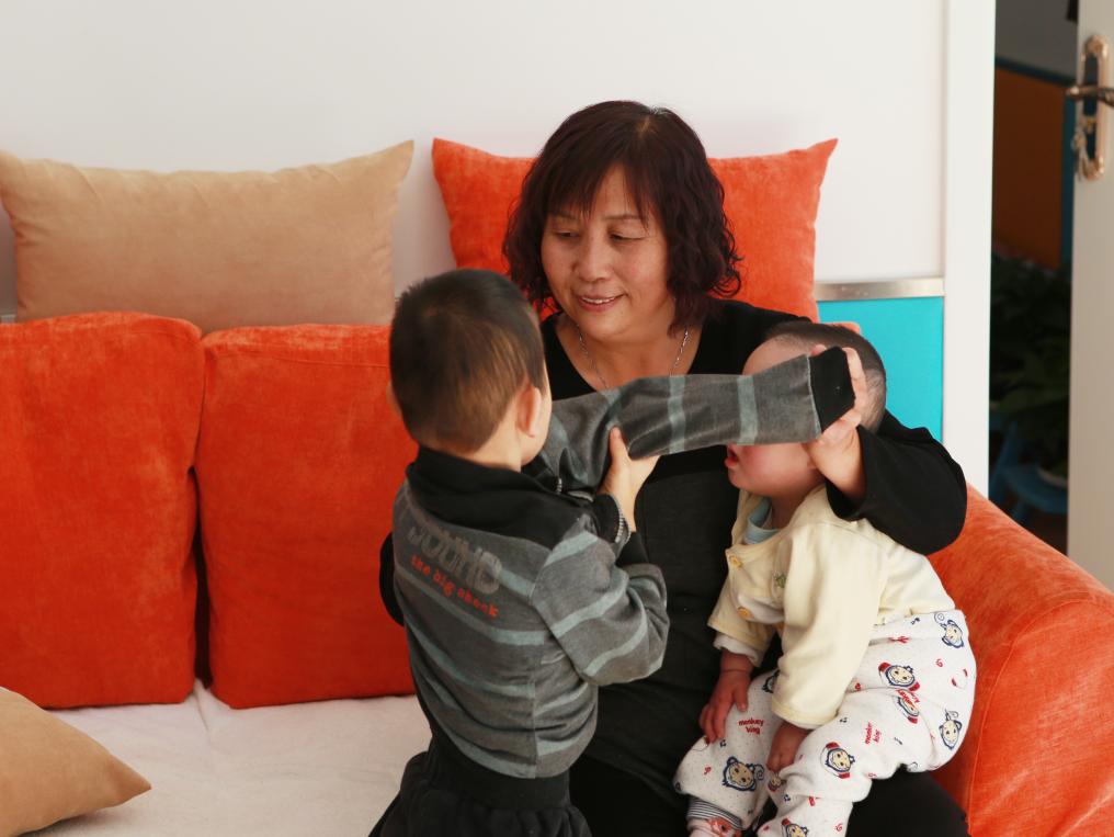 2017年11月3日,内蒙古呼和浩特市儿童福利院里,“爱心妈妈”景凤英抱着两个孩子。新华社记者 王婧嫱 摄