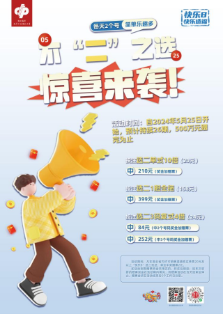 2024年5元25日起,凡在湖北省内许可销售渠道购买单票20元及以上“快乐8”选二玩法,对固定中奖奖级进行赠票,单注选二中二奖金由19元赠票后增至21元。(赠票兑取最后截止日为活动结束后5个工作日)