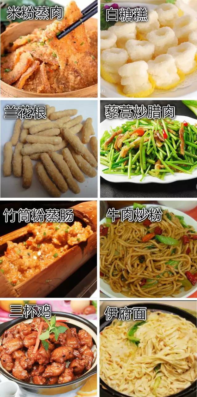 南昌小吃有:白糖糕、糖画、豫章酥鸭、李渡酒、石头街麻花、瓦罐汤和拌粉、牛舌头、金线吊葫芦、芥菜团子、酿冬瓜圈、家乡锅巴、大回饼、木瓜凉粉、伊府面、吊楼烧饼、状元糕、麻辣烫、南昌米粉、军山湖大闸蟹、葛粉、麻辣藕片、万寿宫马打滚、万寿宫糊羹、风味烤卤、竹筒粉蒸肠、藜蒿炒腊肉、煌上煌……