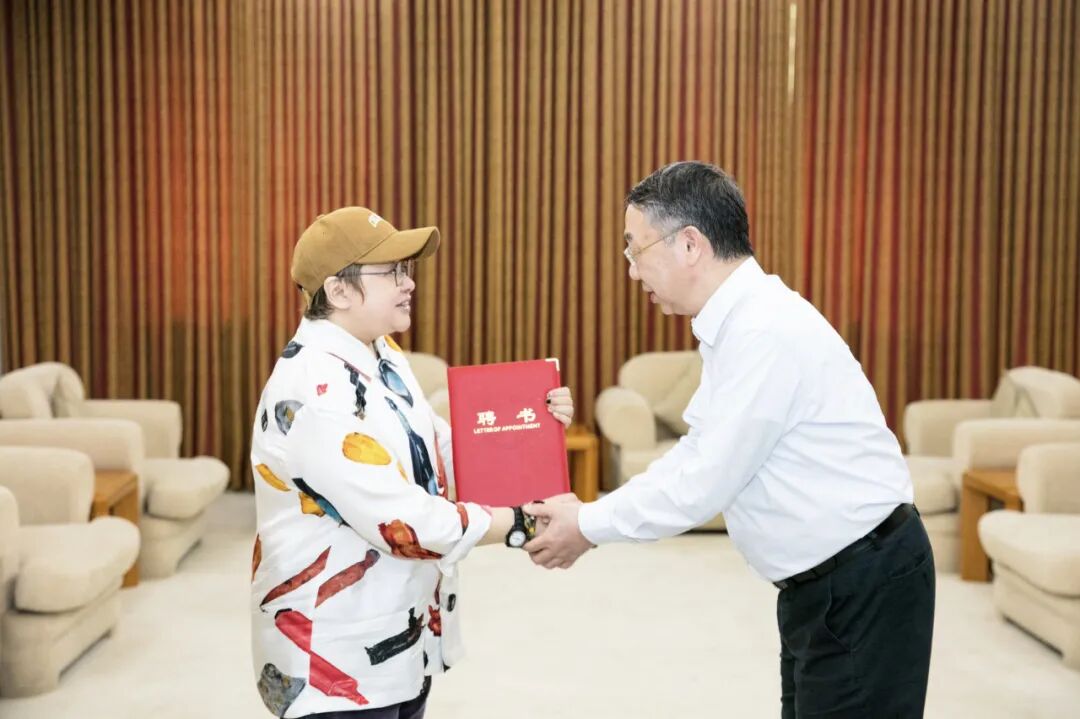 董事长朱自强为韩红颁发特聘教授证书。未来,韩红将通过来校开设讲座、开展实践教学等多种形式助力学校人才培养和事业发展。