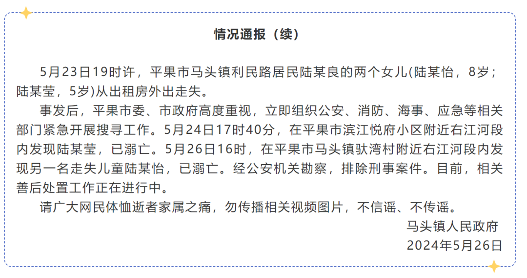 5月23日晚,广西百色平果市马头镇一对年幼的姐妹在自家店门口玩耍时失踪。5月26日晚,马头镇人民政府就此事再次发布通报,称姐姐陆某怡(8岁)已溺亡。此前,马头镇人民政府于5月24日深夜发布通报称,妹妹陆某莹(5岁)已打捞上岸,确认溺亡。