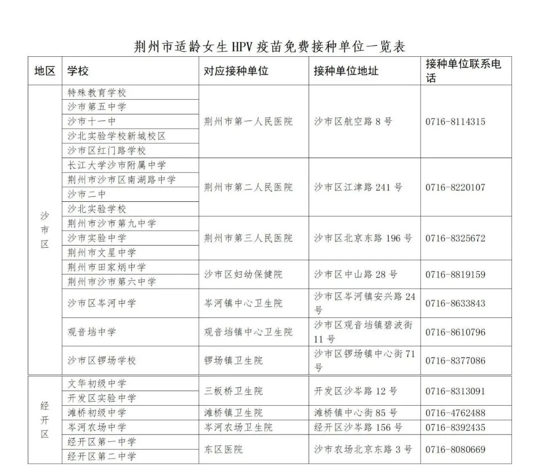 按照荆州市卫健委、荆州市教育局等四部门印发的《荆州市适龄女生人乳头瘤病毒疫苗免费接种项目实施方案》,全市正式启动适龄女生2价HPV疫苗免费接种活动。