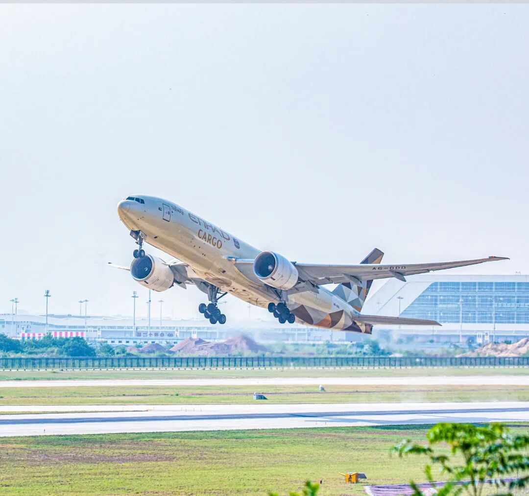 2023年8月,一架阿联酋阿提哈德航空的波音777-200全货机在鄂州花湖机场起飞。(湖北日报全媒记者 薛婷 摄)