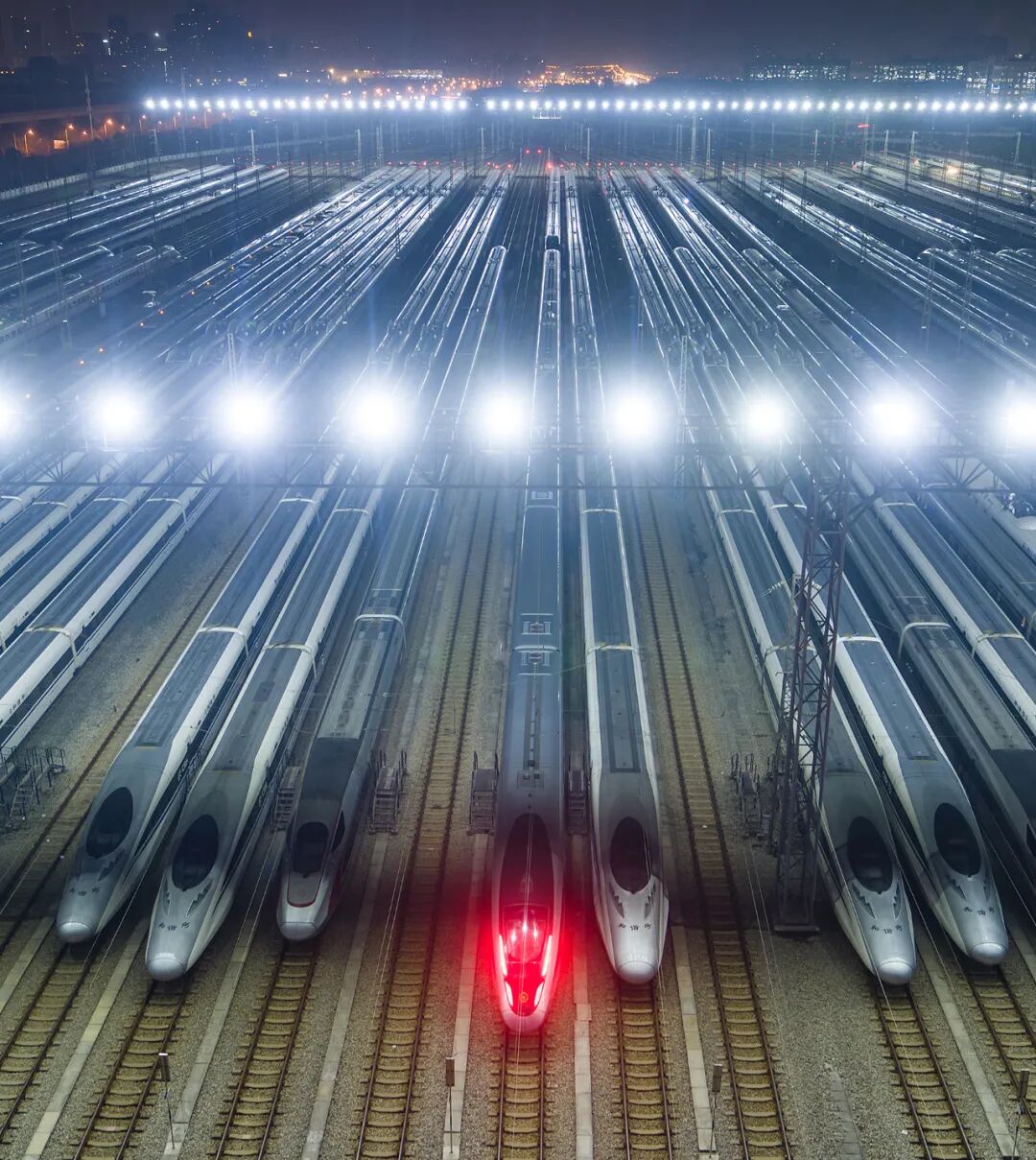 2024年1月,武汉动车段存车线上,一列列完成检修的动车组集结完毕,犹如“陆地航母”一般,蓄势待发。(湖北日报全媒记者 任勇 摄)