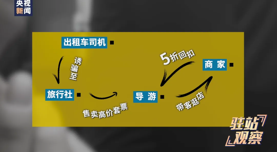 经过这段时间的蹲点暗访,记者发现,从被出租司机拉到旅行社经营的散客中心购买高价套票,再到导游、商家联手诱导消费,环环相扣,已经形成了一条完整的“灰色产业链”。