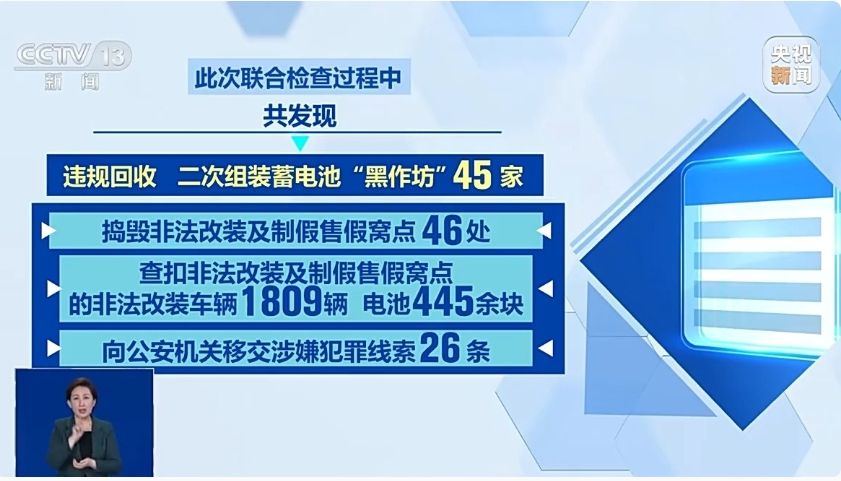 此次联合检查过程中,共发现违规回收、二次组装蓄电池“黑作坊”45家,捣毁非法改装及制假售假窝点46处,查扣非法改装及制假售假窝点的非法改装车辆1809辆、电池445块,向公安机关移交涉嫌犯罪线索26条。