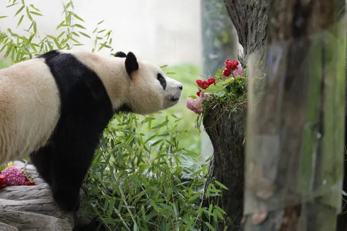 上午9点,40余名“熊猫粉丝”和20多家中外媒体早已在“福宝”圈舍外的游客参观区域,翘首以盼“福宝”出场。9点35分,当通往外运动场的小门打开后,“福宝”从内舍缓缓走出,在新家院子里好奇地四处张望、嗅闻,探索了一圈以后,准确找到了摆放在运动场的食物,随即悠闲享受美味的竹笋。