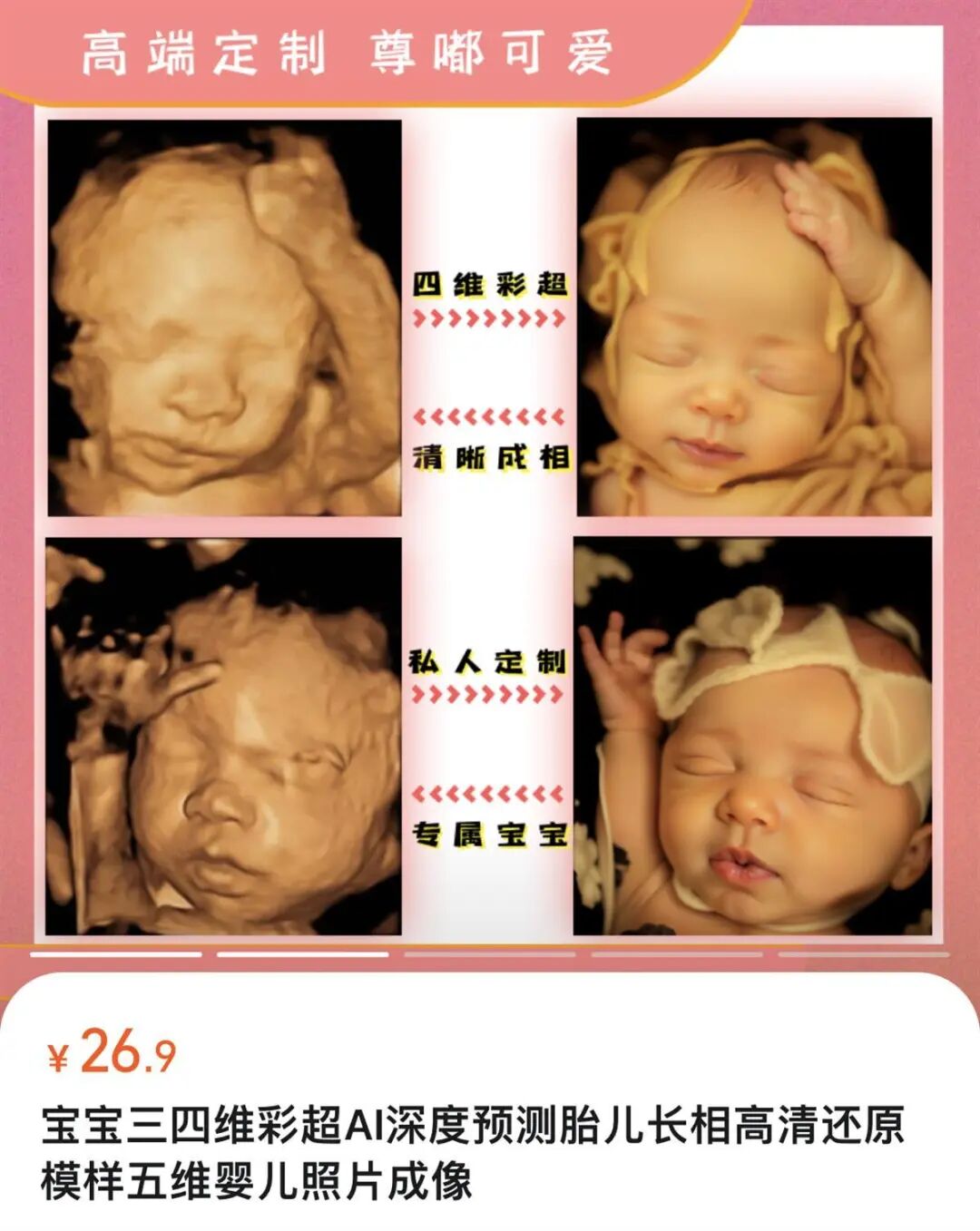 在电商平台上,利用四维彩超图生成一张宝宝照片最低只需6.8元,等待半小时就能出片,最火的商家已接了上万单。在某微信小程序,用户也可自行上传四维彩超图,免费生成预测照片。