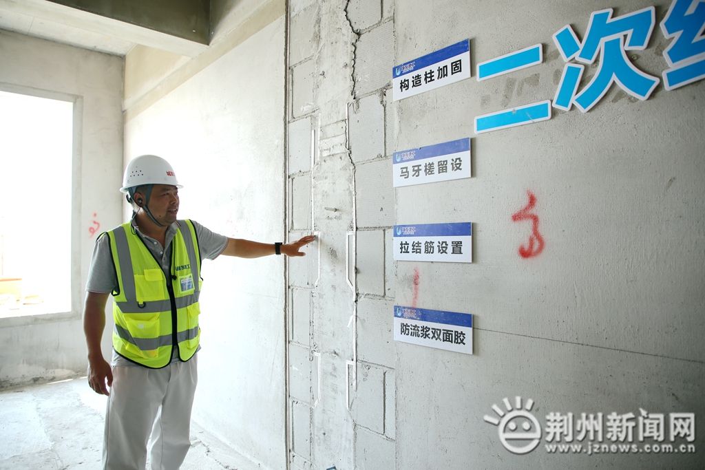 在项目现场可以看到,整个工地干净整洁,几乎看不到施工产生的扬尘。荆州市城发建设工程集团有限公司项目执行经理杨帆介绍,这是由于工地安装了全自动电驱雾桩喷淋系统与现场扬尘监测设备,二者联动,可根据PM值实施自动化喷淋,实现无尘施工。