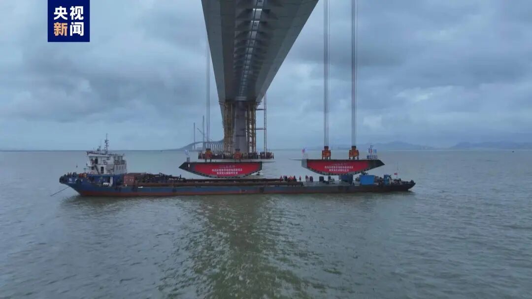 据了解,此次吊装的是黄茅海主桥合龙口最后两节分体钢箱梁,重约180吨。