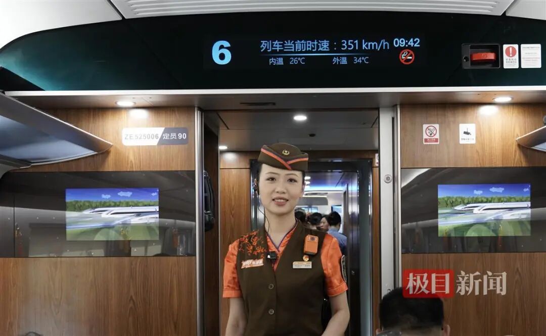 上午9:08,列车启动8分钟后,车厢内的电子屏显示列车当前速度已达到351公里/小时。车窗外,铁路沿线的美景飞速后退,列车运行依然十分平稳。