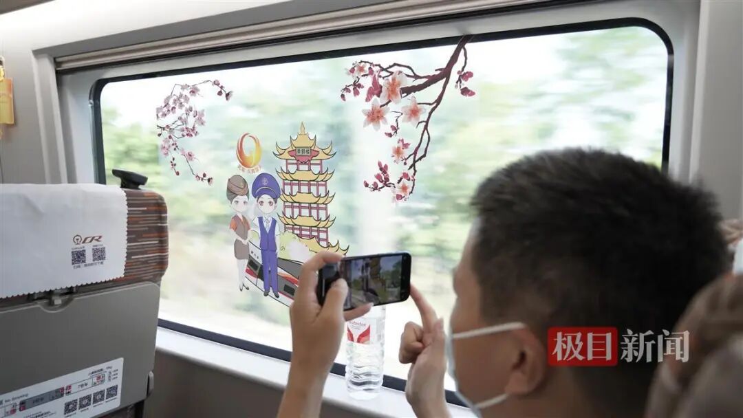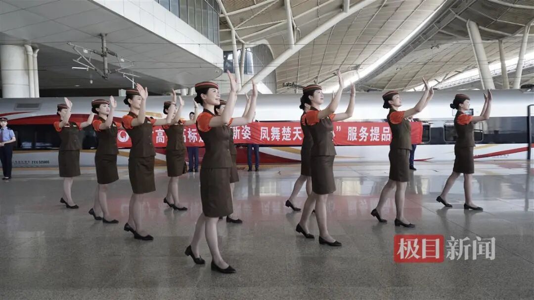 为迎接首趟标杆车的旅客上车,来自武汉客运段、武汉火车站、武昌南机务段的工作人员身穿制服,在1号站台进行了服务礼仪操等形象展示。极目新闻记者看到,旅客们举起相机纷纷记录下这一刻。