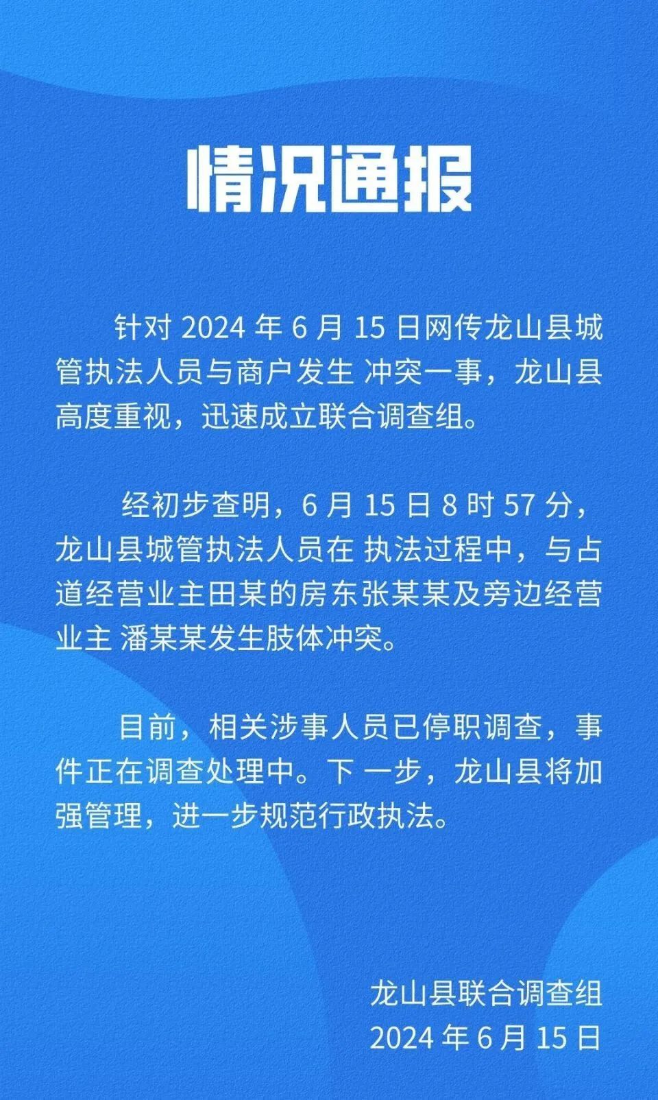 针对2024年6月15日网传龙山县城管执法人员与商户发生冲突一事,龙山县高度重视,迅速成立联合调查组。