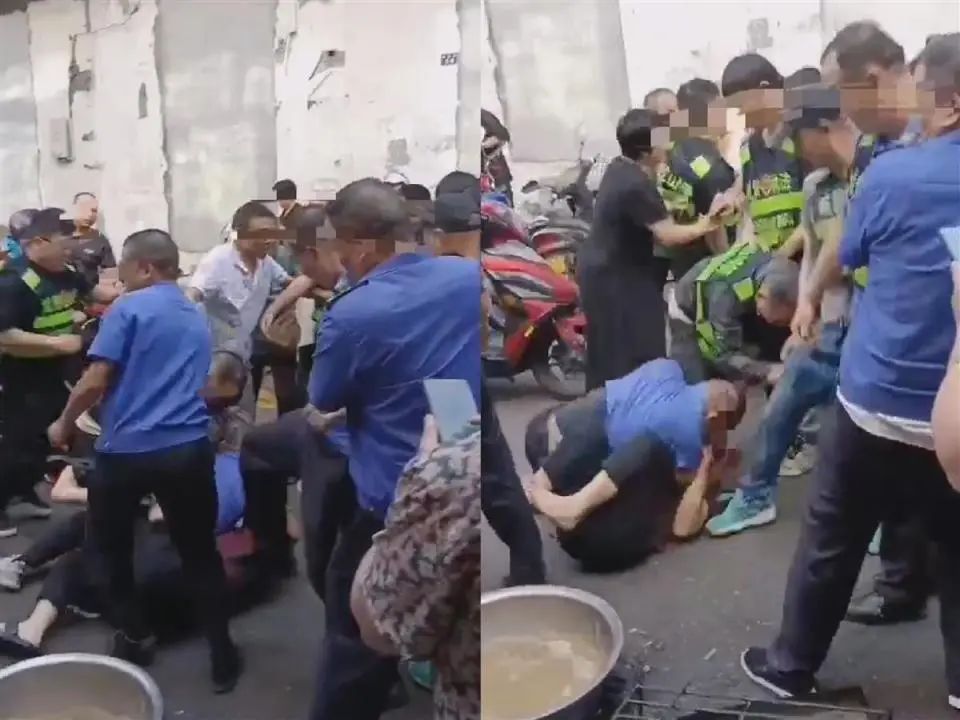 视频显示,多名身着“城管执法”“龙山城管”字样衣服的工作人员与身着白色、红色衣服等人员发生肢体冲突,现场一片混乱。