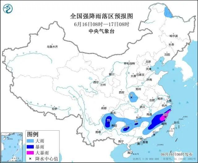 预计今日8时至17日8时,四川盆地南部、贵州大部、湖南南部、江西中部和东部、浙江南部和东部、福建大部、广西东北部、广东东北部和东南部沿海及河南南部、湖北北部、黑龙江西北部等地部分地区有大到暴雨,其中,浙江东南部、福建东北部等地部分地区有大暴雨(100~200毫米)。上述部分地区伴有短时强降水(最大小时降雨量30~50毫米,局地可超过60毫米),局地有雷暴大风等强对流天气。