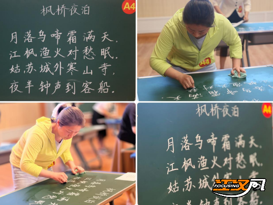粉笔字书写环节,郑淼老师认真而专注,以漂亮端正的字体、遒劲有力的笔锋、自然起伏的章法,完成了七言绝句《枫桥夜泊》的书写。