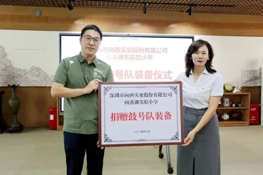 签约仪式上,深圳市向西实业股份有限公司向洪湖实验小学捐赠了鼓号队装备。