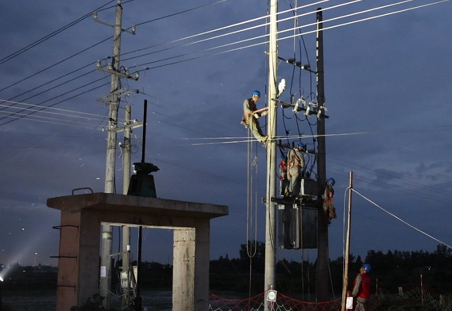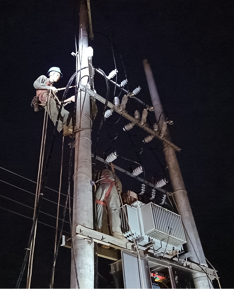 除了雨水的冲刷外,作业人员们还面临着夜间视线弱、蚊虫叮咬等多重挑战。他们身披夜色,手持工具,在微弱的灯光下每一个动作都充满了坚定与专注。汗水湿透了他们的衣衫,蚊虫的骚扰也未曾让他们有片刻停歇,经过5个小时的连续奋战,新的变压器终于成功架设并投入使用,为60余名用户排涝设备提供了稳定可靠的电力支持。